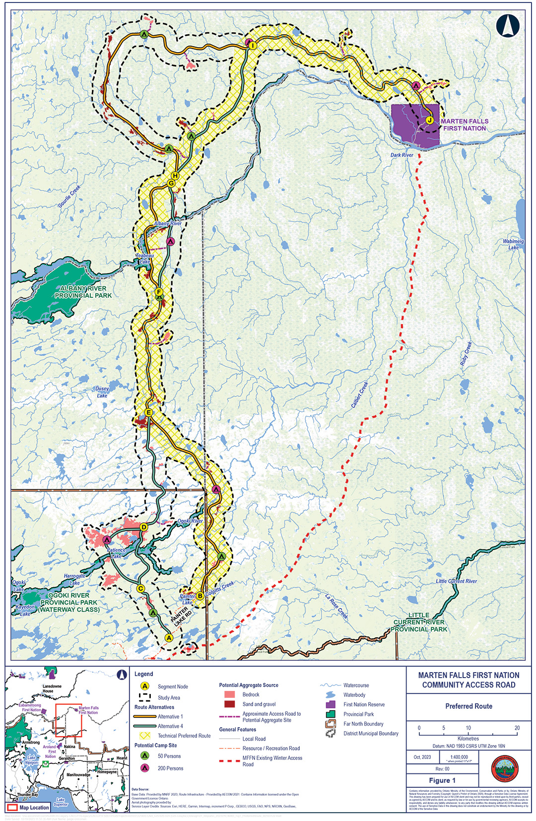 There are currently two alternatives being considered (Alternative 1 and Alternative 4). Each alternative starts at Painter Lake Road and runs north before turning eastward toward Marten Falls First Nation, roughly following the west / north side of the Albany River.